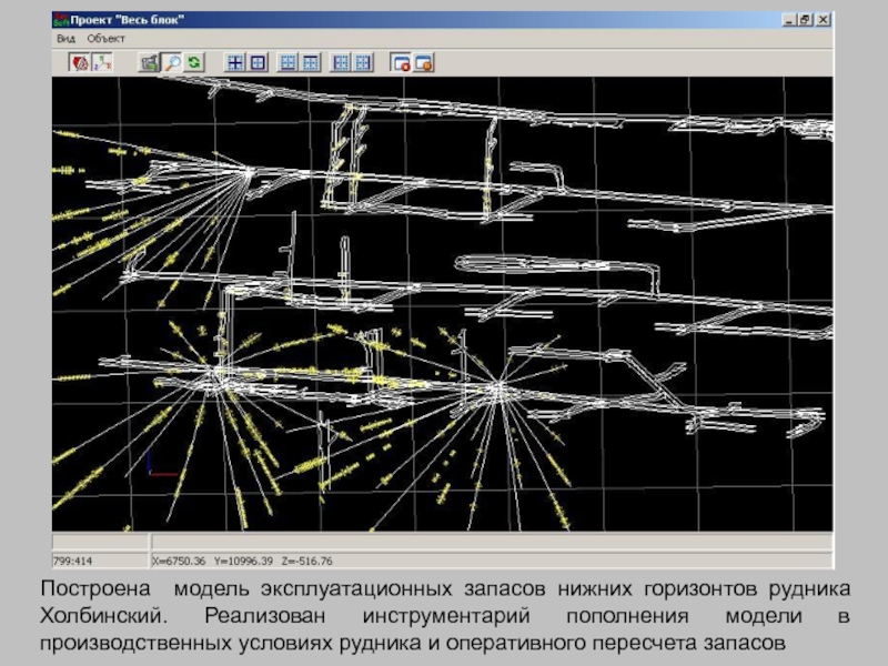 Слайд 19Построена модель эксплуатационных запасов нижних горизонтов рудника Холбинский. Реализован инструментарий пополнения