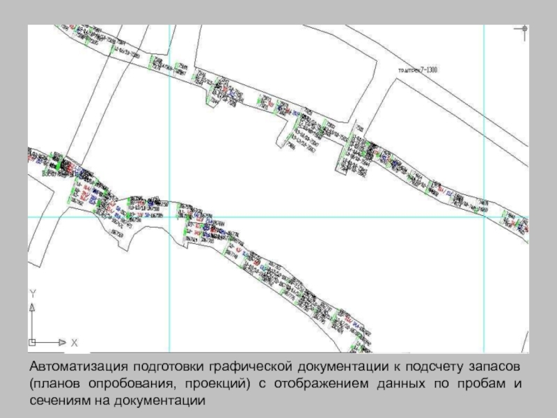 Слайд 14Автоматизация подготовки графической документации к подсчету запасов (планов опробования, проекций) с