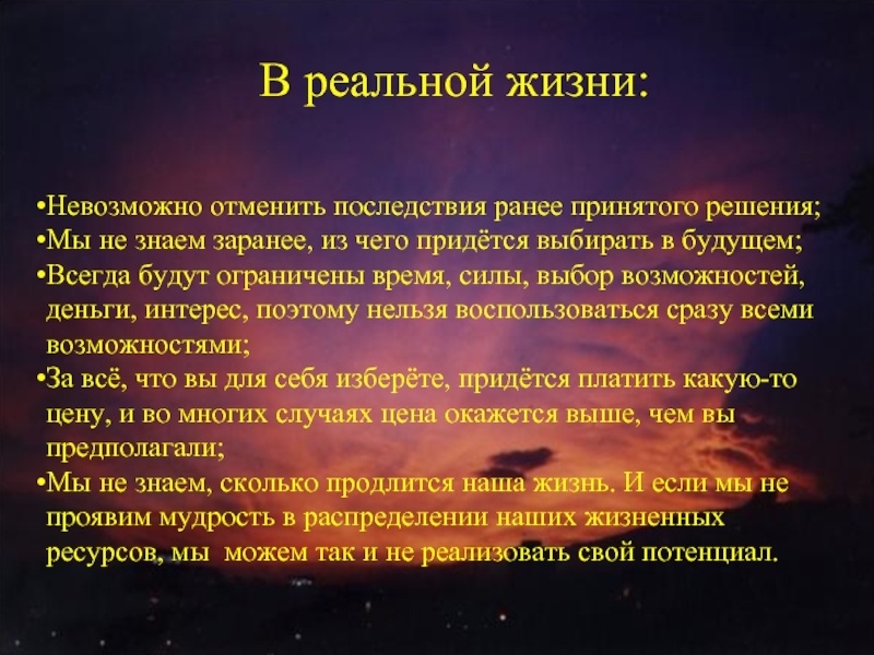Всегда будут ограничены время, силы, выбор возможностей, деньги, интерес, поэтому нельзя воспользоваться сразу всеми возможностями;