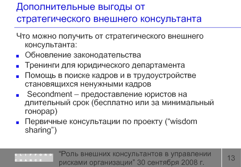 Secondment – предоставление юристов на длительный срок (бесплатно или за минимальный гонорар)