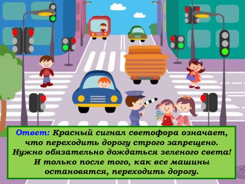 Ответ: Красный сигнал светофора означает, что переходить дорогу строго запрещено. Нужно обязательно дождаться зеленого света! И только после того, как все машины остановятся, переходить дорогу.