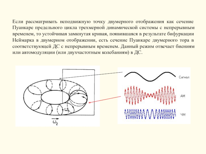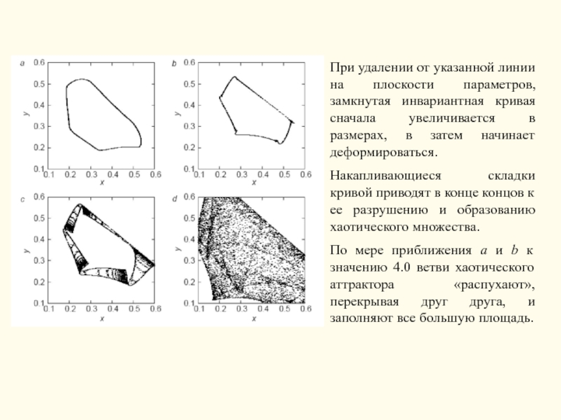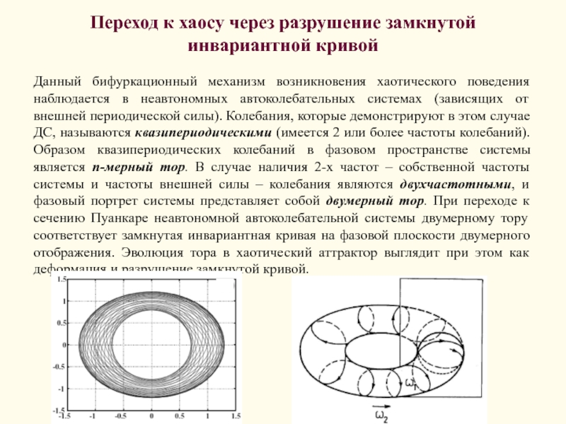 Чтобы проследить эволюцию тора в хаотический аттрактор, проанализируем поведение замкнутой инвариантной кривой в сечении Пуанкаре. В качестве примера рассмотрим двумерное отображение