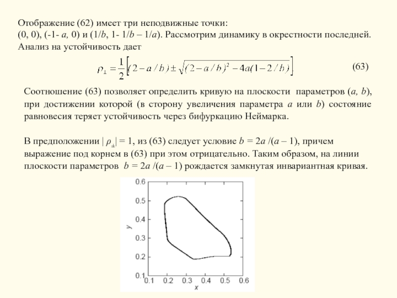 Соотношение (63) позволяет определить кривую на плоскости параметров (a, b), при достижении которой (в сторону увеличения параметра a или b) состояние равновесия теряет устойчивость через бифуркацию Неймарка.