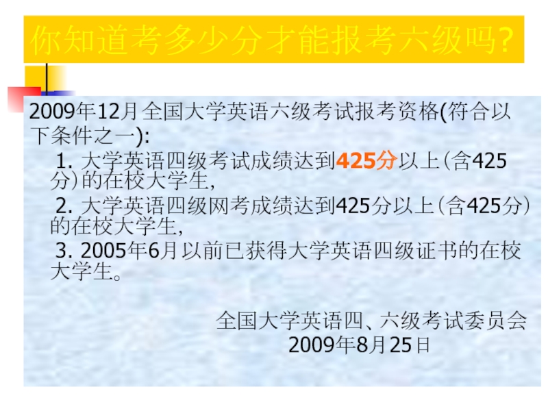 Слайд 92009年12月全国大学英语六级考试报考资格(符合以