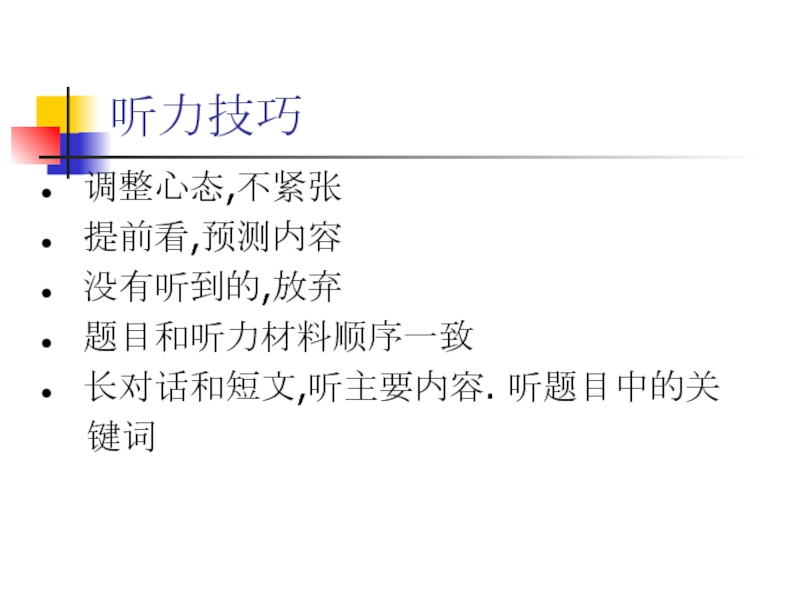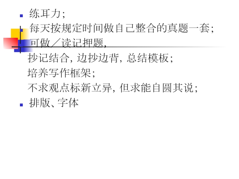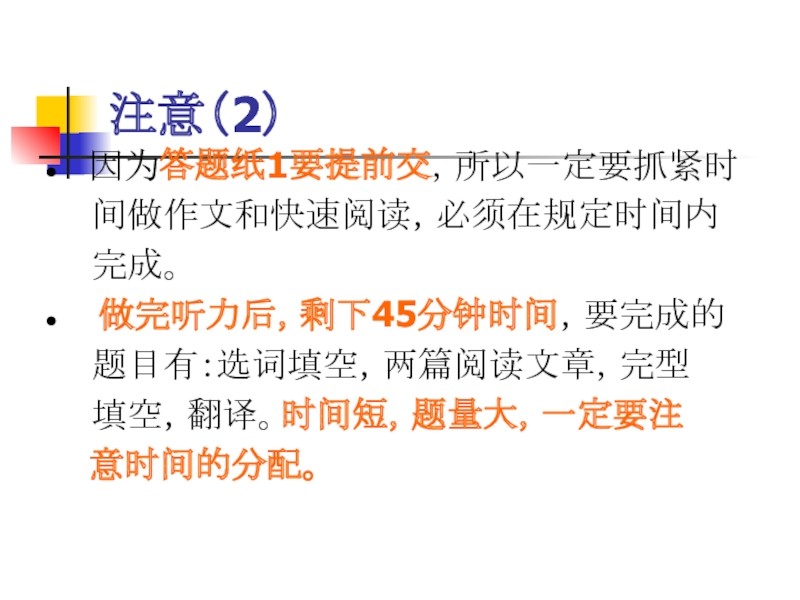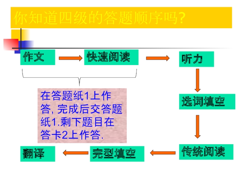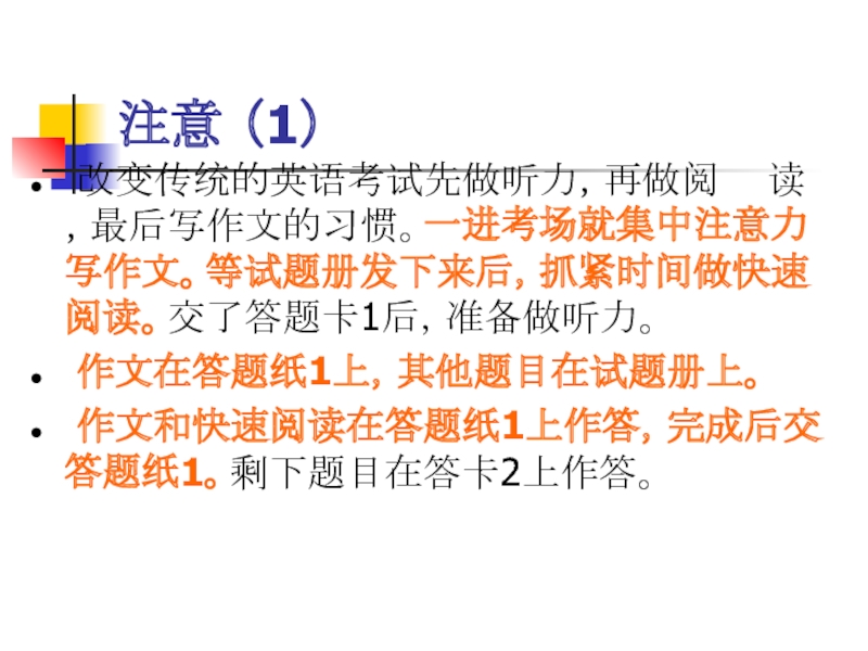改变传统的英语考试先做听力,再做阅 读,最后写作文的习惯。一进考场就集中注意力写作文。等试题册发下来后,抓紧时间做快速阅读。交了答题卡1后,准备做听力。