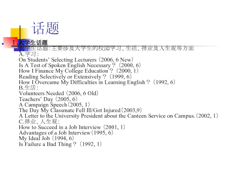 Ⅰ.大学生话题   大学生话题:主要涉及大学生的校园学习、生活、择业及人生观等方面   A.学习:   On Students’ Selecting Lecturers (2006, 6 New)   Is A Test of Spoken