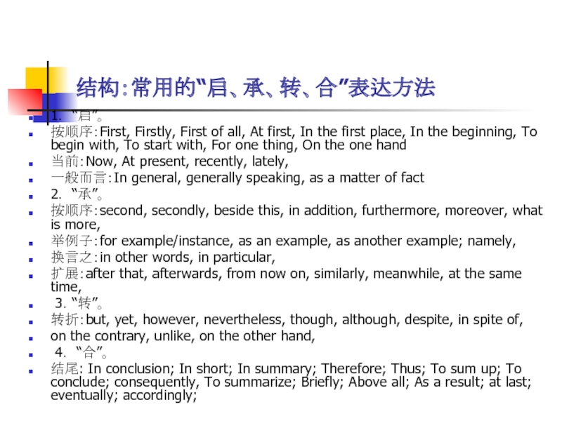 Слайд 18结构:常用的“启、承、转、合”表达方法