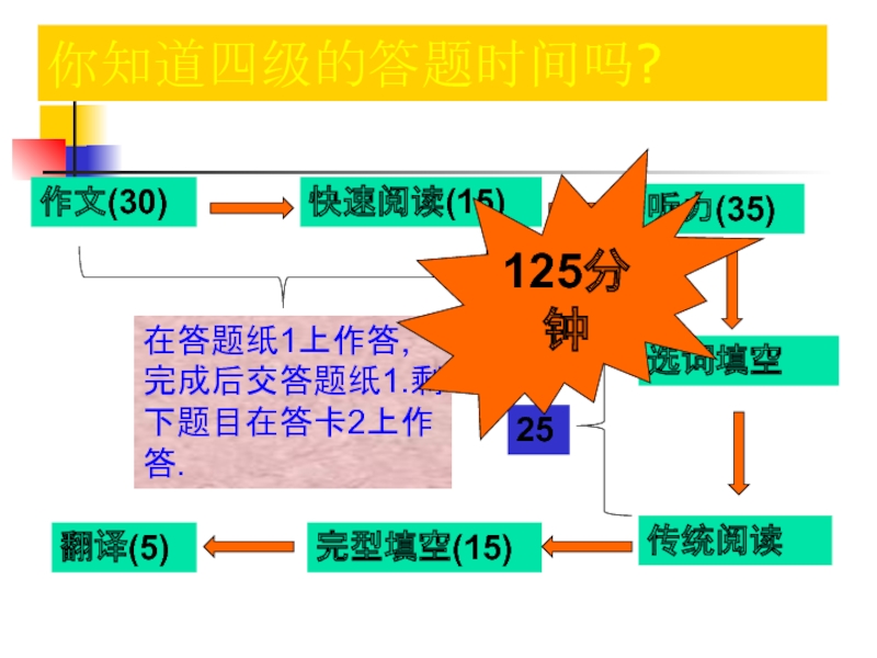 8:50---9:00试音时间 9:00---9:10播放考场指令,发放作文考卷 9:10取下耳机,开始作文考试 作文(9:10- 9:40) 9:35 发放含有快速阅读的试题册