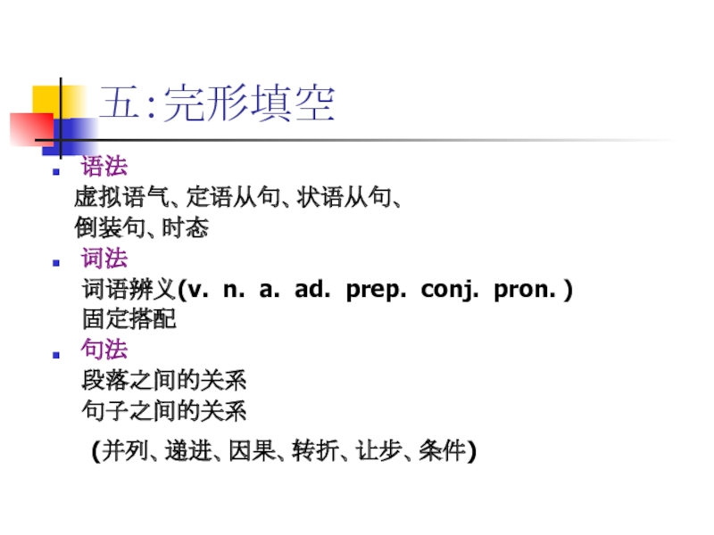 Слайд 45从句(主语,宾语,表语,定语,状语),非谓语动词,强调句,倒装,虚拟语气,词组,句型。