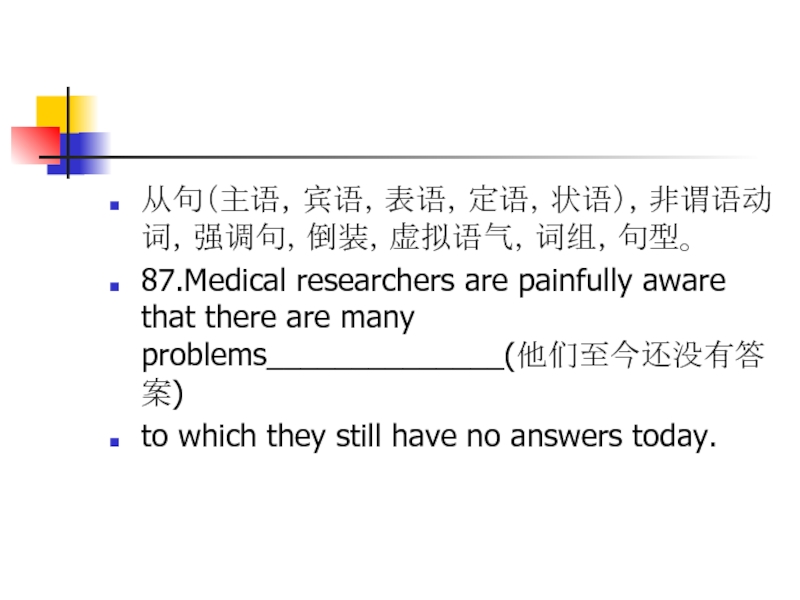 87.Medical researchers are painfully aware that there are many problems______________(他们至今还没有答案)