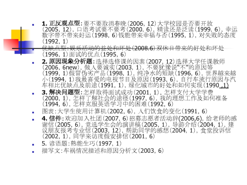 2. 原因现象分析题:选择选修课的因素(2007,12)选择大学任课教师(2006,6new),做人要诚实(2003,1),不要犹豫说“不”的原因等(1999,1)假冒伪劣产品(1998,1),纯净水的短缺(1996,6),世界越来越小(1994,1)我最喜爱的电视节目及原因(1993,6),自行车流行原因与汽车相比优缺点及前途(1991,1),绿化城市的好处和如何实现(1990 ,1)