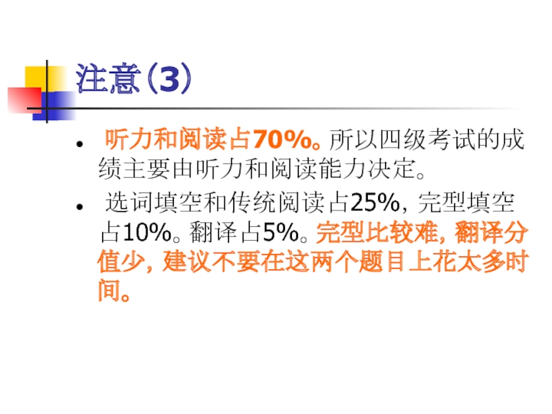 听力和阅读占70%。所以四级考试的成绩主要由听力和阅读能力决定。