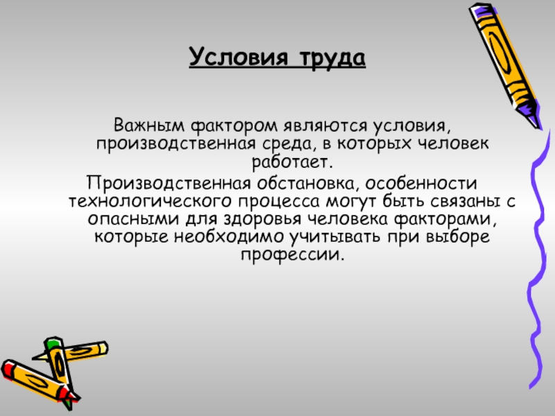 Важным фактором являются условия, производственная среда, в которых человек работает.