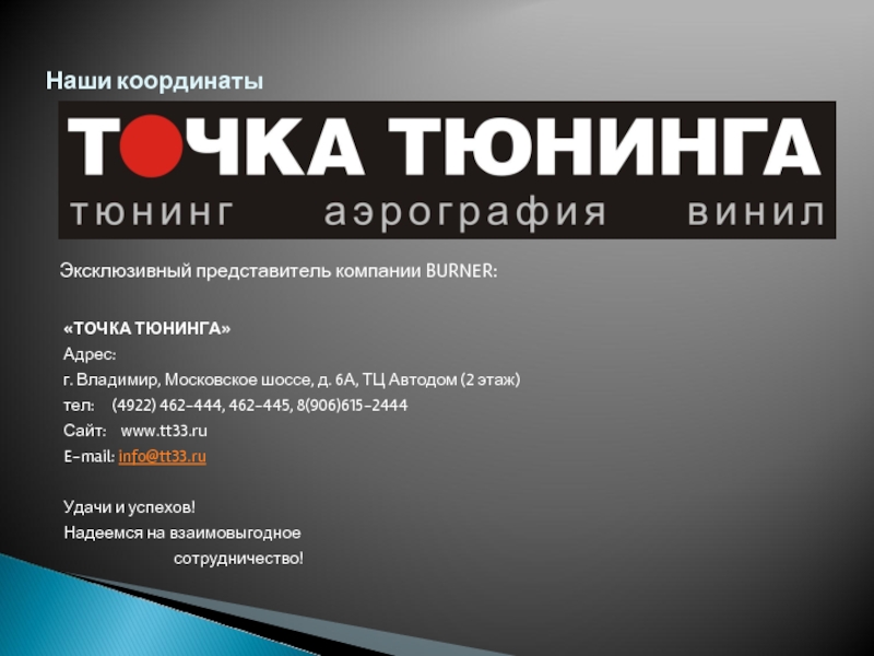 разработку и проведение совместных рекламных компаний, выпуск общих рекламных материалов, направленных как на продвижение Ваших магазинов, так и на представление достоинств щеток Burner.
