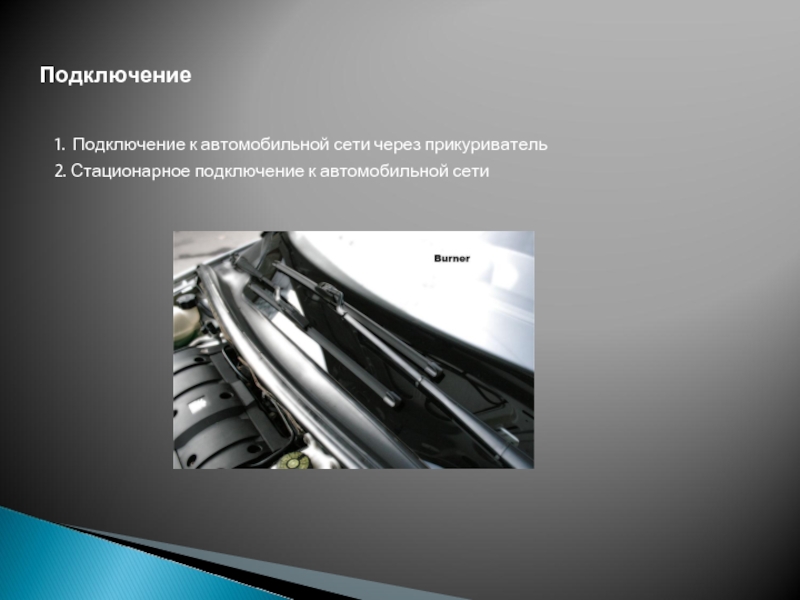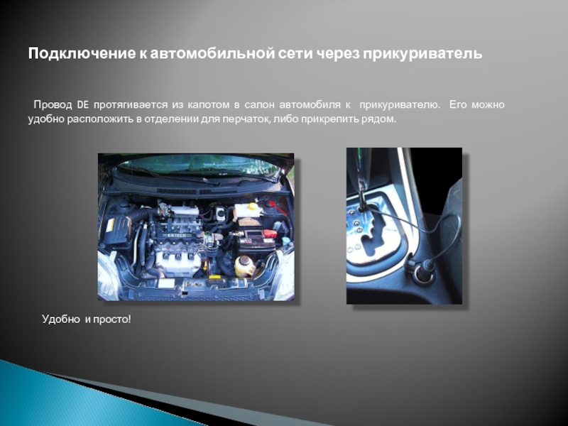 Слайд 8Подключение к автомобильной сети через прикуриватель
