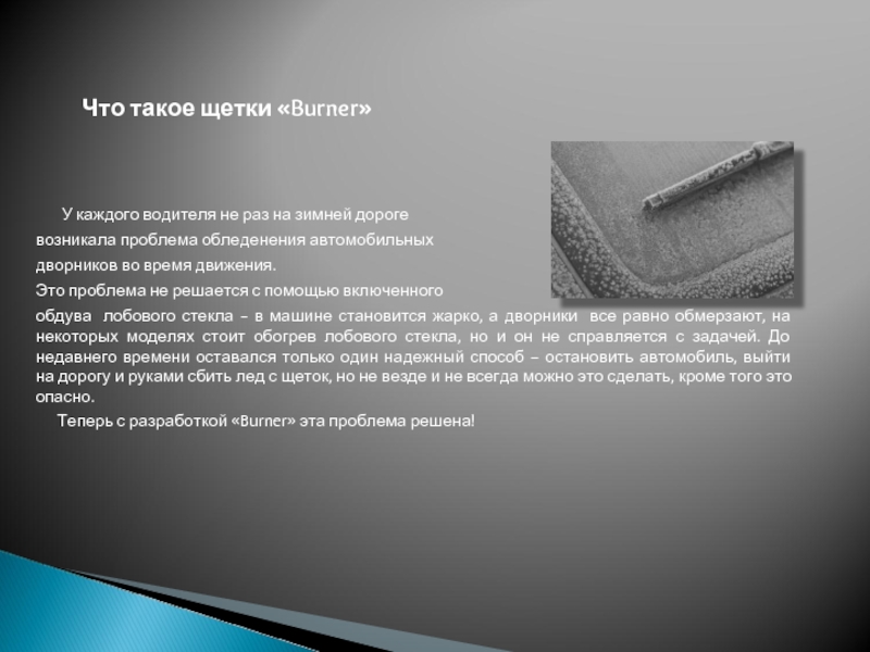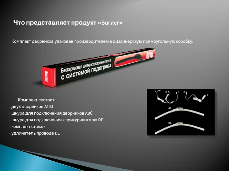 Уникальность продукта заключается в технологии подогрева чистящего полотна щетки. Эта технология разработана и запатентована компанией «Burner». Благодаря ей, стеклоочистители в любую погоду остаются полностью работоспособными и эффективными.