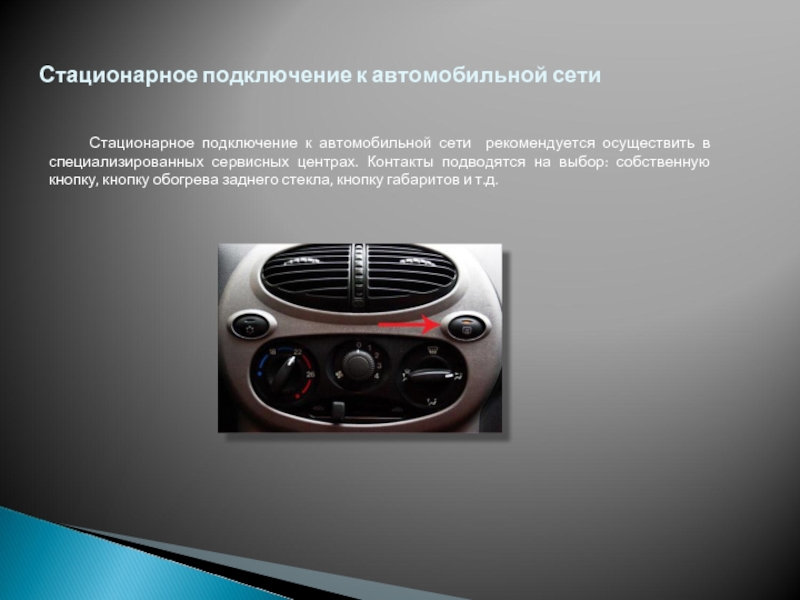 к автомобильной сети рекомендуется осуществить в специализированных сервисных центрах. Контакты подводятся на выбор: собственную кнопку, кнопку обогрева заднего стекла, кнопку габаритов и т.д.