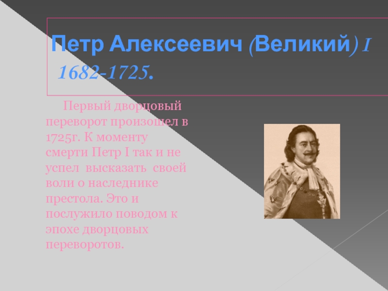произошел в 1725г. К моменту смерти Петр I так и не успел высказать своей воли о наследнике престола. Это и послужило поводом к эпохе дворцовых переворотов.