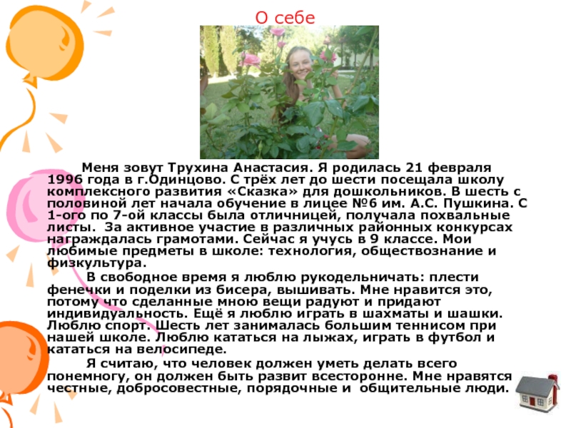 Меня зовут Трухина Анастасия. Я родилась 21 февраля 1996 года в г.Одинцово. С трёх лет до шести посещала школу комплексного развития «Сказка» для дошкольников. В шесть с половиной лет начала обучение в лицее №6 им. А.С. Пушкина. С 1-ого по 7-ой классы была отличницей, получала похвальные листы. За активное участие в различных районных конкурсах награждалась грамотами. Сейчас я учусь в 9 классе. Мои любимые предметы в школе: технология, обществознание и физкультура.