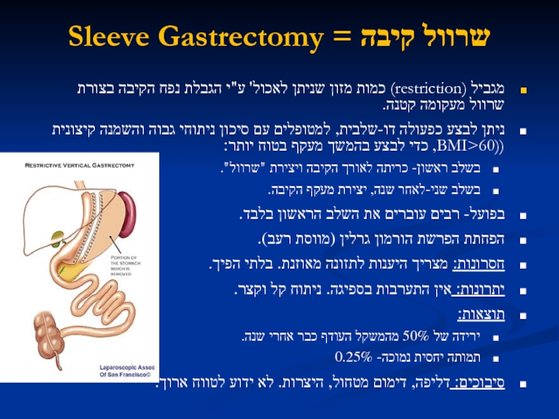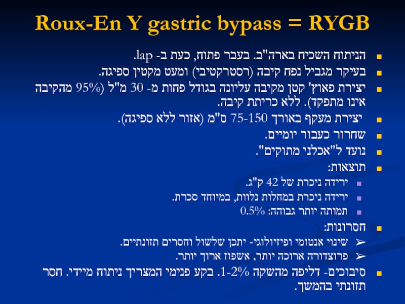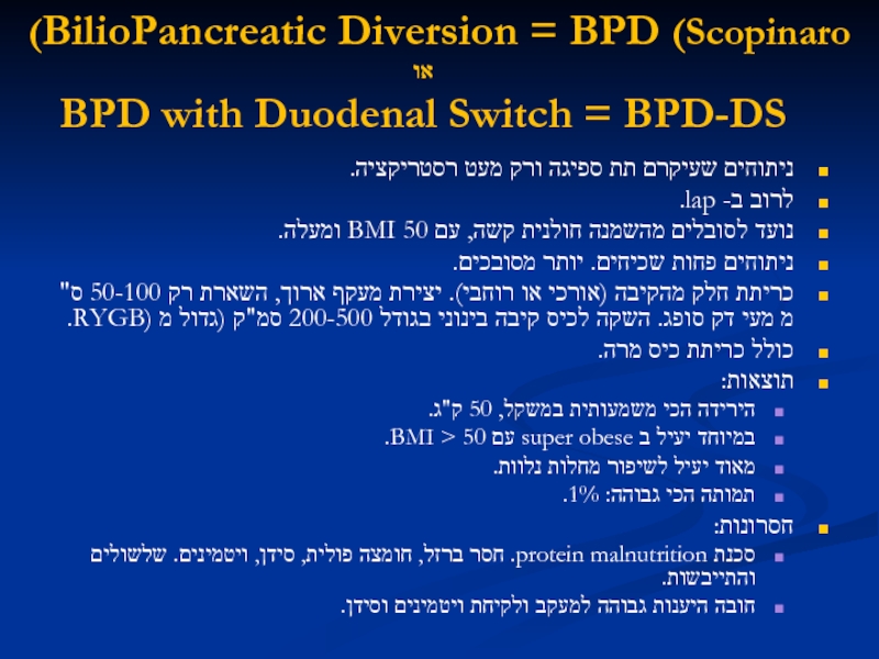 כריתת חלק מהקיבה (אורכי או רוחבי). יצירת מעקף ארוך, השארת רק 50-100 ס"מ מעי דק סופג. השקה לכיס קיבה בינוני בגודל 200-500 סמ"ק (גדול מ (RYGB.
