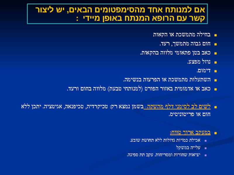 אם למנותח אחד מהסימפטומים הבאים, יש ליצור קשר עם הרופא המנתח באופן מיידי :