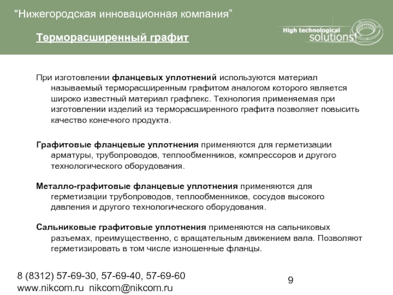 уплотнений используются материал называемый терморасширенным графитом аналогом которого является широко известный материал графлекс. Технология применяемая при изготовлении изделий из терморасширенного графита позволяет повысить качество конечного продукта.