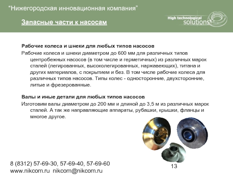 Рабочие колеса и шнеки диаметром до 600 мм для различных типов центробежных насосов (в том числе и герметичных) из различных марок сталей (легированных, высоколегированных, наржавеющих), титана и других материалов, с покрытием и без. В том числе рабочие колеса для различных типов насосов. Типы колес - односторонние, двухсторонние, литые и фрезерованные.