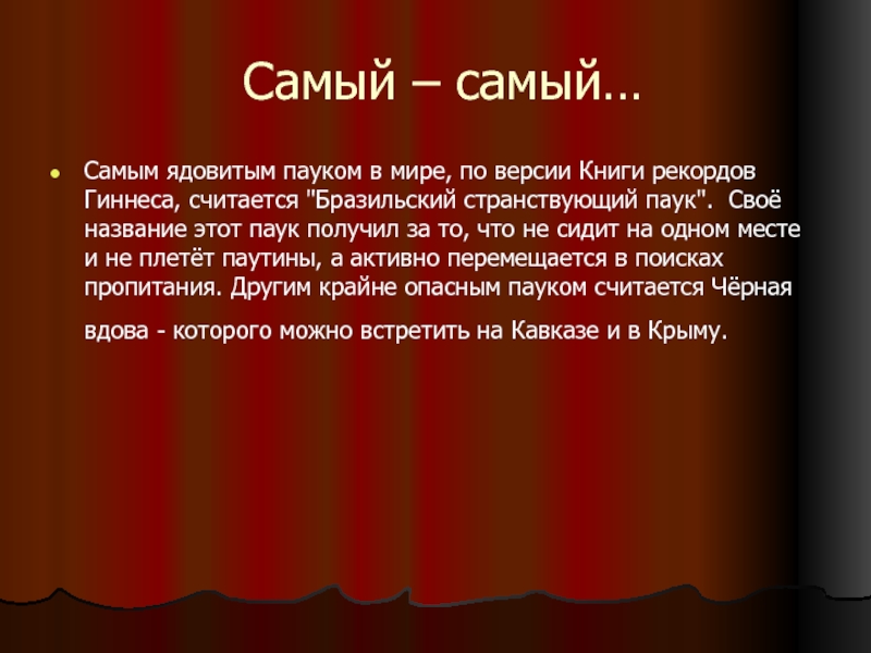 Гиннеса, считается "Бразильский странствующий паук". Своё название этот паук получил за то, что не сидит на одном месте и не плетёт паутины, а активно перемещается в поисках пропитания. Другим крайне опасным пауком считается Чёрная вдова - которого можно встретить на Кавказе и в Крыму.