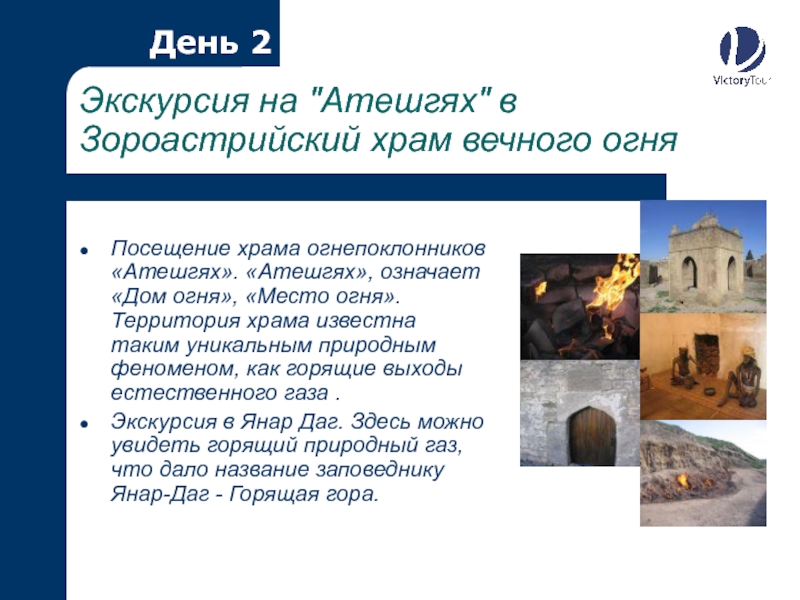 Посещение храма огнепоклонников «Атешгях». «Атешгях», означает «Дом огня», «Место огня». Территория храма известна таким уникальным природным феноменом, как горящие выходы естественного газа .