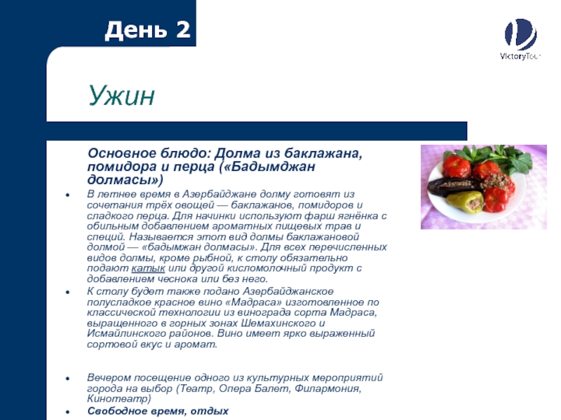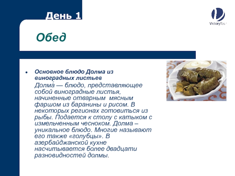 Долма́ — блюдо, представляющее собой виноградные листья, начиненные отварным мясным фаршом из баранины и рисом. В некоторых регионах готовиться из рыбы. Подается к столу с катыком с измельченным чесноком. Долма – уникальное блюдо. Многие называют его также «голубцы». В азербайджанской кухне насчитывается более двадцати разновидностей долмы.