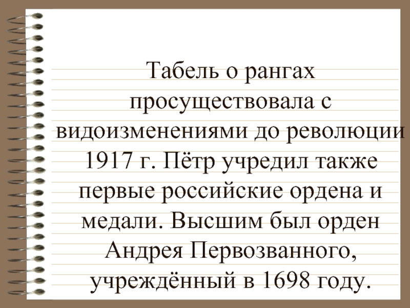 Табель о рангах просуществовала с видоизменениями до революции 1917 г. Пётр