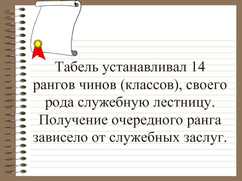 Слайд 3Табель устанавливал 14 рангов чинов (классов), своего рода служебную лестницу. Получение
