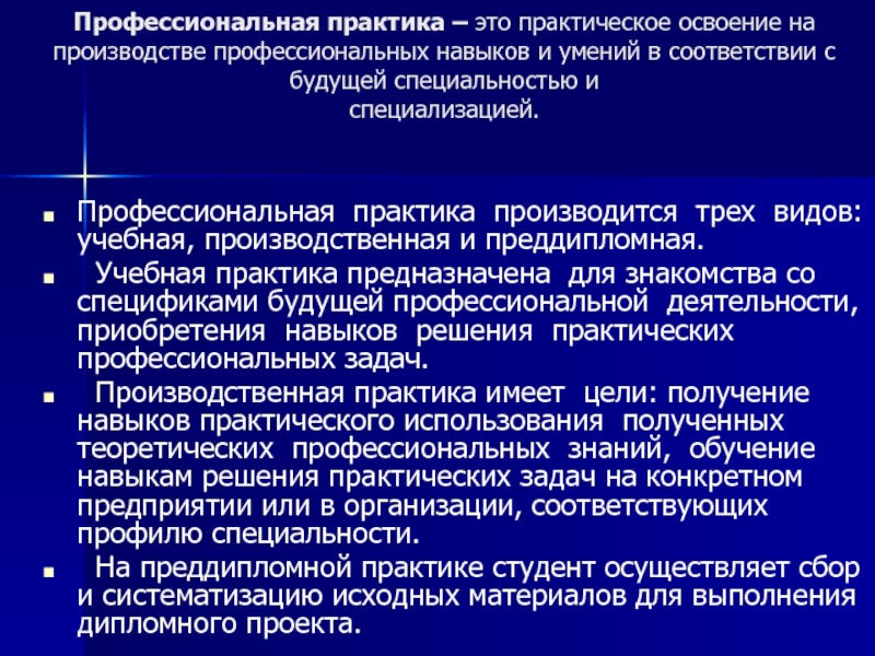Профессиональная практика производится трех видов: учебная, производственная и преддипломная.