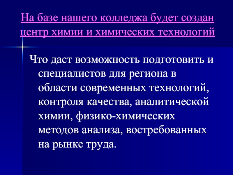 Что даст возможность подготовить и специалистов для региона в области современных технологий, контроля качества, аналитической химии, физико-химических методов анализа, востребованных на рынке труда.