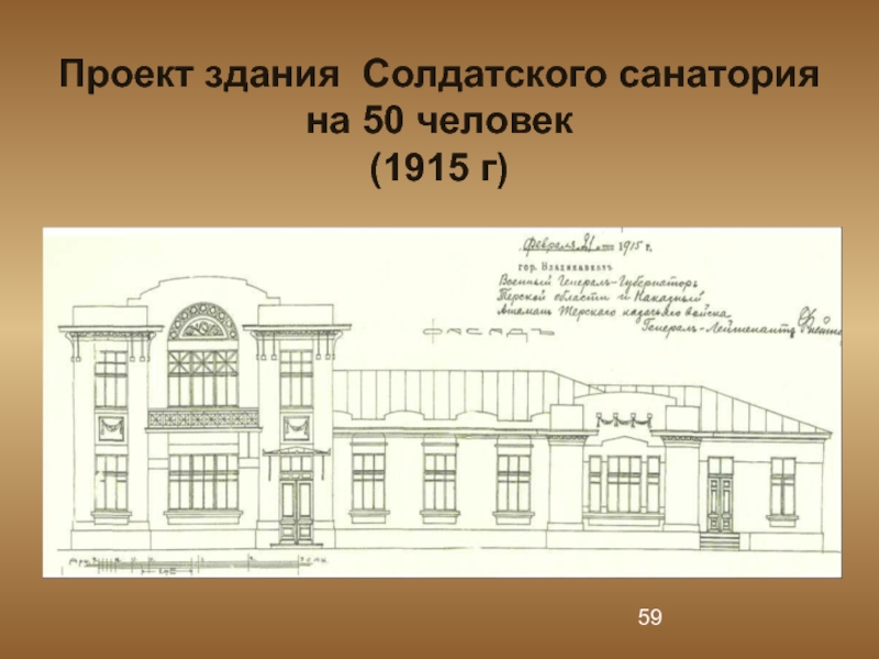 Слайд 59Проект здания Солдатского санатория на 50 человек (1915 г)
