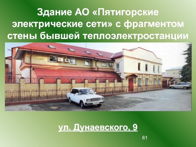 Слайд 61Здание АО «Пятигорские электрические сети» с фрагментом стены бывшей теплоэлектростанции