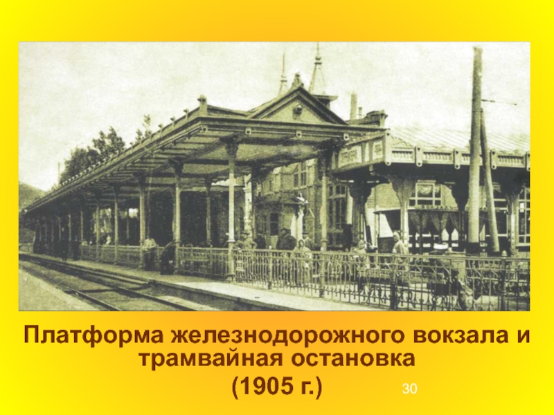 Слайд 30Платформа железнодорожного вокзала и трамвайная остановка (1905 г.)