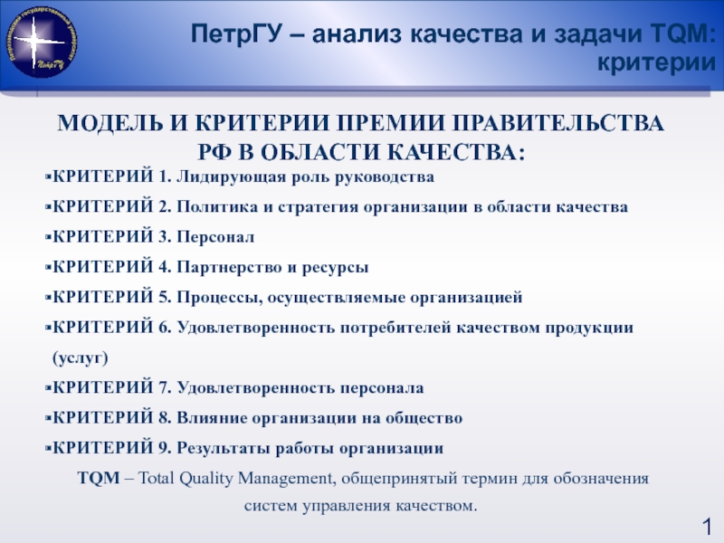 Вопросы анкет разбиты на 9 критериев в соответствии с моделью и критериями премии Правительства Российской Федерации в области качества.