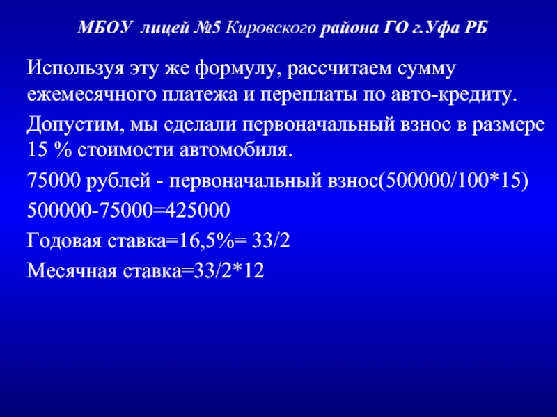 рассчитаем сумму ежемесячного платежа и переплаты по авто-кредиту.