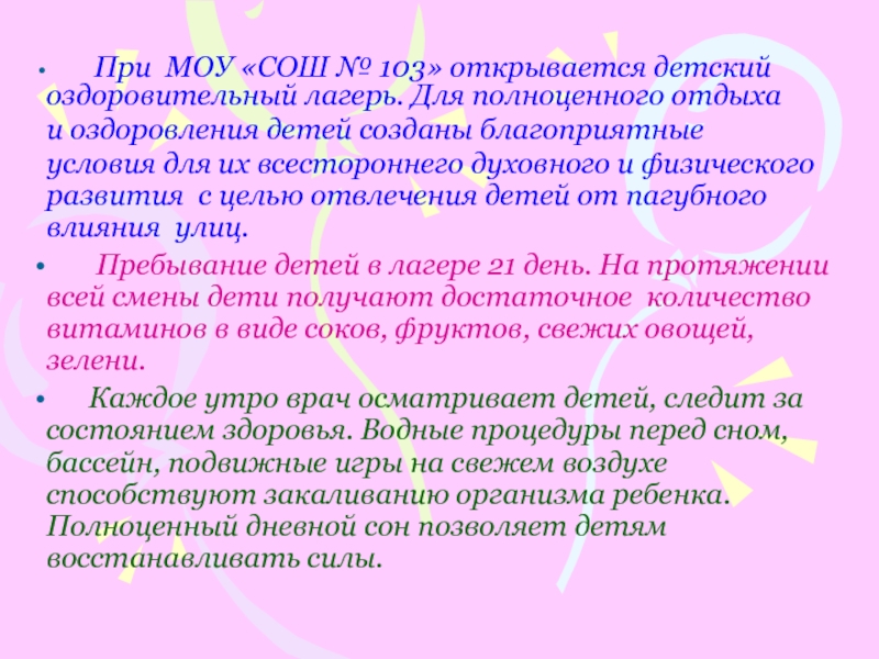 103» открывается детский оздоровительный лагерь. Для полноценного отдыха