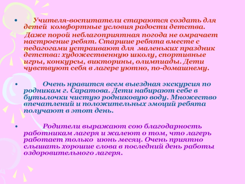 Даже порой неблагоприятная погода не омрачает настроение ребят. Старшие ребята вместе с педагогами устраивают для маленьких праздник детства: художественную школу, спортивные игры, конкурсы, викторины, олимпиады. Дети чувствуют себя в лагере уютно, по-домашнему.