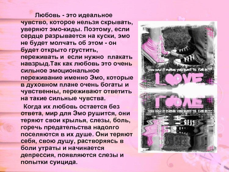 Слайд 39 Любовь - это идеальное чувство, которое нельзя скрывать, уверяют эмо-киды. Поэтому,