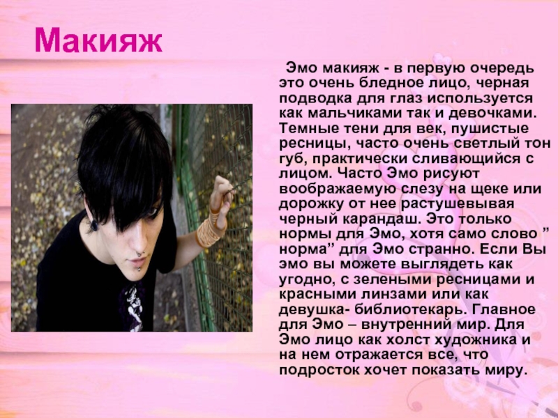 подводка для глаз используется как мальчиками так и девочками. Темные тени для век, пушистые ресницы, часто очень светлый тон губ, практически сливающийся с лицом. Часто Эмо рисуют воображаемую слезу на щеке или дорожку от нее растушевывая черный карандаш. Это только нормы для Эмо, хотя само слово ”норма” для Эмо странно. Если Вы эмо вы можете выглядеть как угодно, с зелеными ресницами и красными линзами или как девушка- библиотекарь. Главное для Эмо – внутренний мир. Для Эмо лицо как холст художника и на нем отражается все, что подросток хочет показать миру.