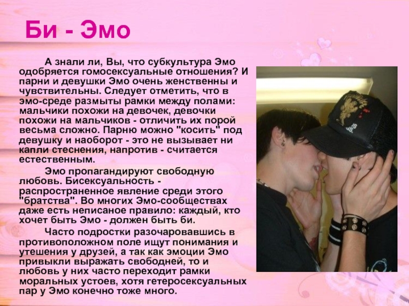 Эмо пропагандируют свободную любовь. Бисексуальность - распространенное явление среди этого "братства". Во многих Эмо-сообществах даже есть неписаное правило: каждый, кто хочет быть Эмо - должен быть би.