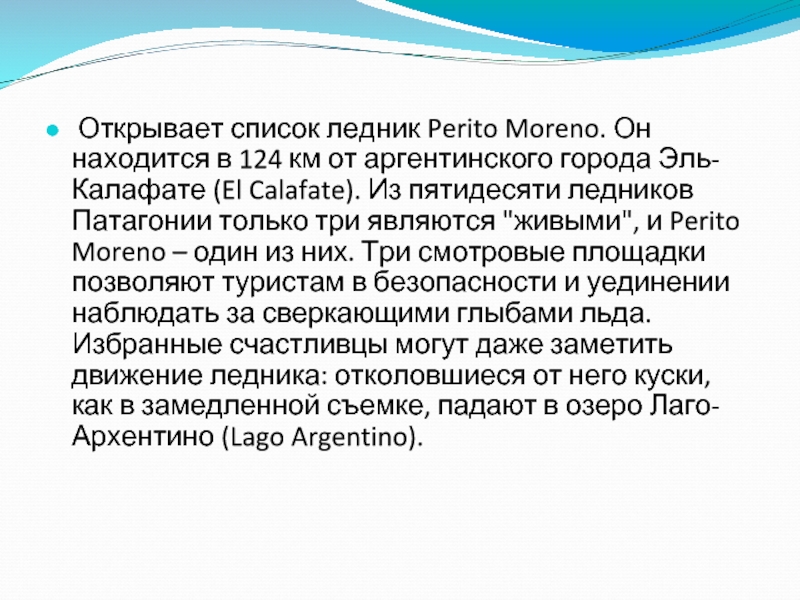 Слайд 3 Открывает список ледник Perito Moreno. Он находится в 124 км