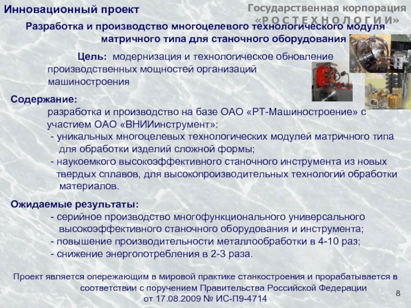 Развитие промышленных технологий и создание высокотехнологичной продукции с высокой долей интеллектуальной добавленной стоимости путем проведения институциональных преобразований отраслей экономики, технологической модернизации производств, привлечения инвестиций в реализацию инновационных проектов, обеспечения деятельности научных школ по выполнению прикладных исследований и коммерциализации их результатов, а также реализация программ финансового оздоровления организаций