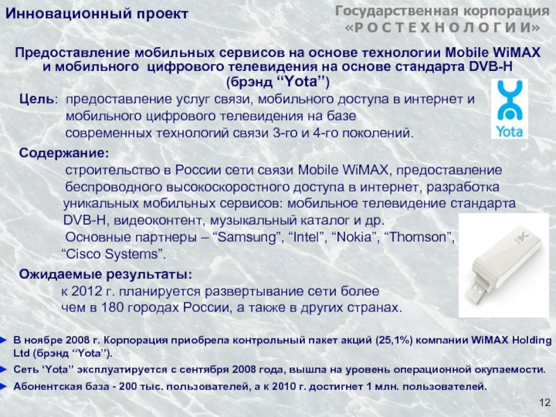 В ноябре 2008 г. Корпорация приобрела контрольный пакет акций (25,1%) компании WiMAX Holding Ltd (брэнд “Yota”).