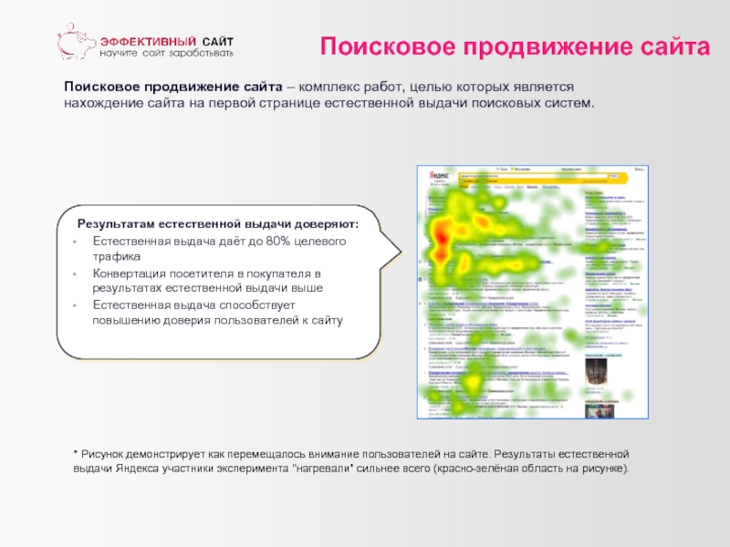 * Рисунок демонстрирует как перемещалось внимание пользователей на сайте. Результаты естественной выдачи Яндекса участники эксперимента "нагревали" сильнее всего (красно-зелёная область на рисунке).