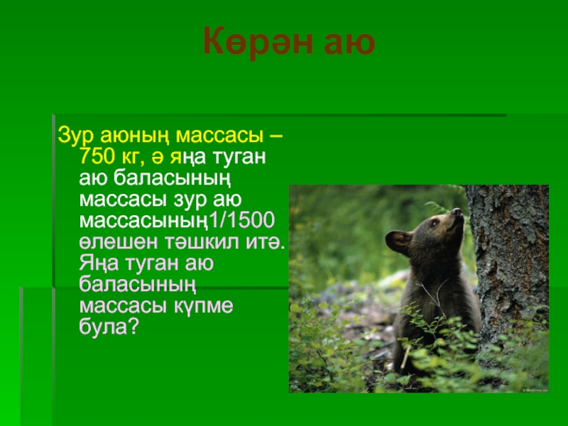 аю баласының массасы зур аю массасының1/5 өлешен тәшкил итсә, аю баласының массасы күпме булыр?