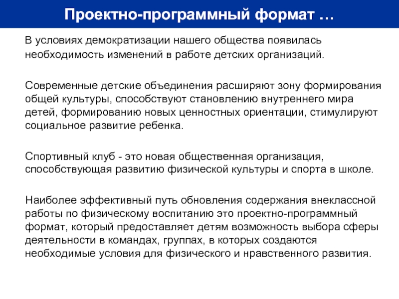 Наиболее эффективный путь обновления содержания внеклассной работы по физическому воспитанию это проектно-программный формат, который предоставляет детям возможность выбора сферы деятельности в командах, группах, в которых создаются необходимые условия для физического и нравственного развития.